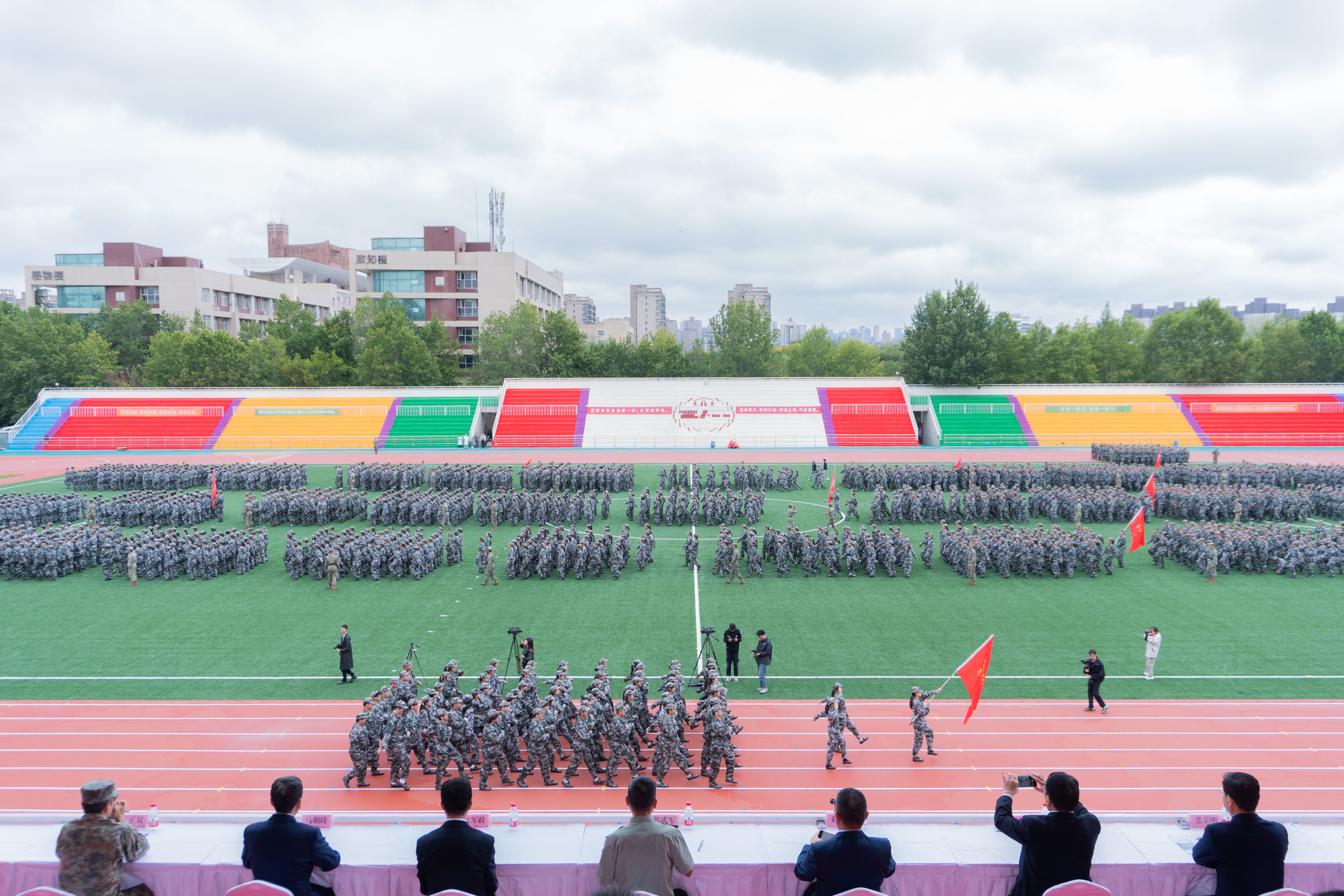 且持梦笔书奇景,日破云涛万里红。 9月19日,必赢2025级本科生开学典礼暨军训总结表彰大会在长安校区田径场举行,3555名新生踏入崭新的人生旅程。全体校领导,党委委员,陆军边海防学院中校、军训旅旅长王正双出席大会。校党委副书记郭武军主持开学典礼。副校长、军训旅副政委孙昊亮主持军训总结表彰大会。