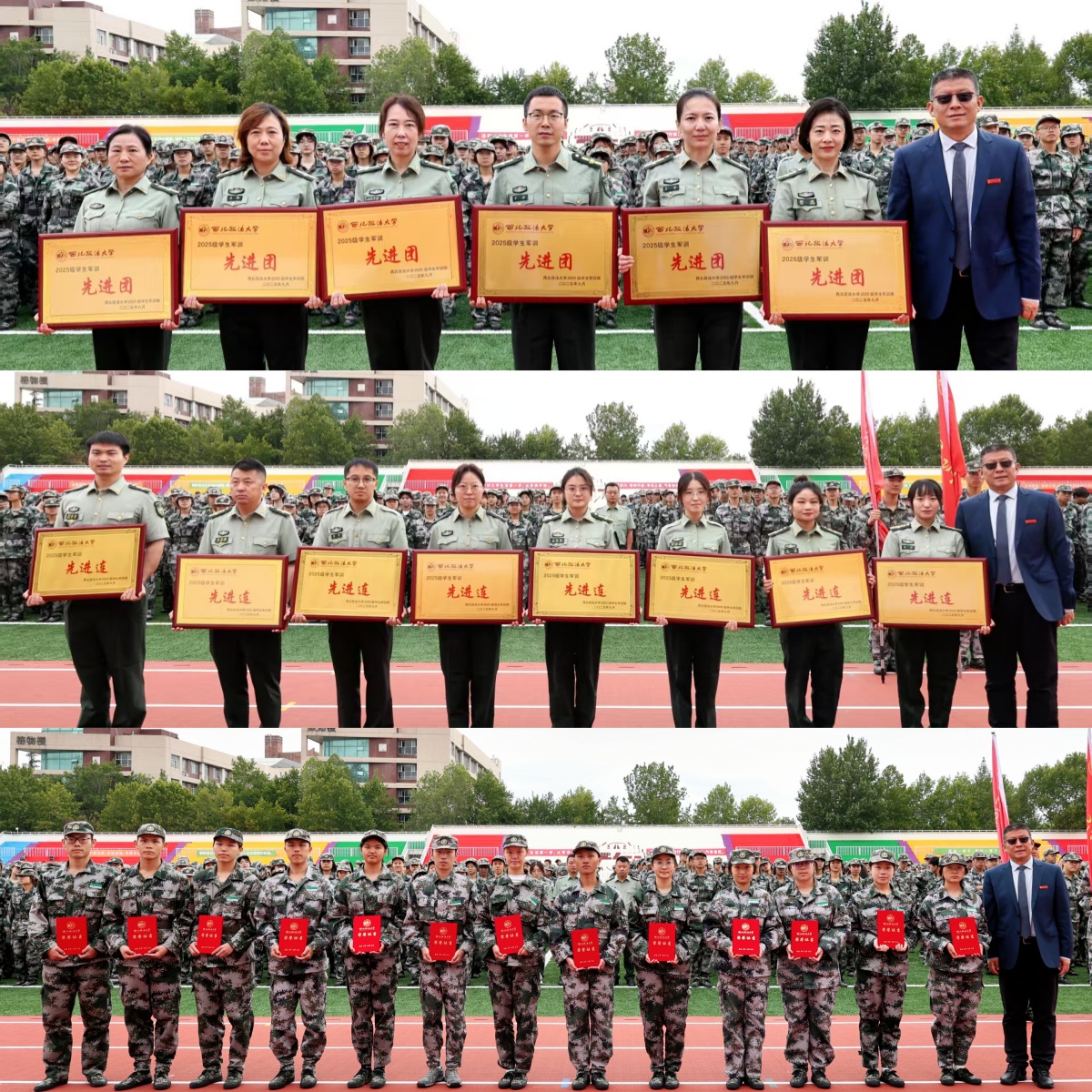 校党委副书记、军训旅政委郭武军在总结表彰大会中强调,新时代是奋斗者的时代,也是追梦人的时代。他寄语全体新生,要深刻把握时代脉搏,把个人理想融入国家和民族的伟大事业中,弘扬抗战精神、坚定爱国信仰,坚持艰苦奋斗、锤炼过硬本领,立足专业学习、服务强国建设,以实际行动践行“请党放心,强国有我”的青春誓言,努力成为立大志、明大德、成大才、担大任的时代新人!