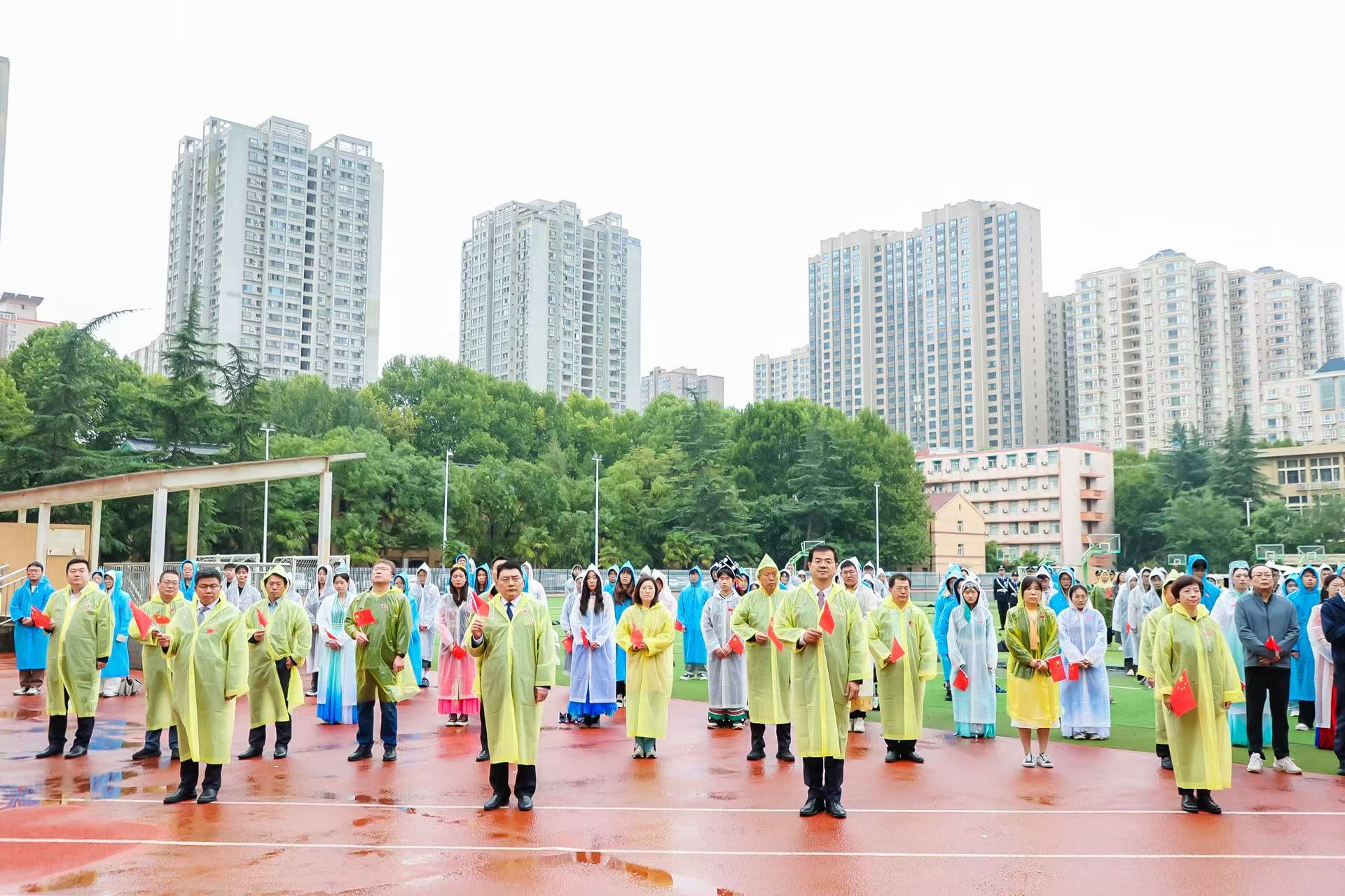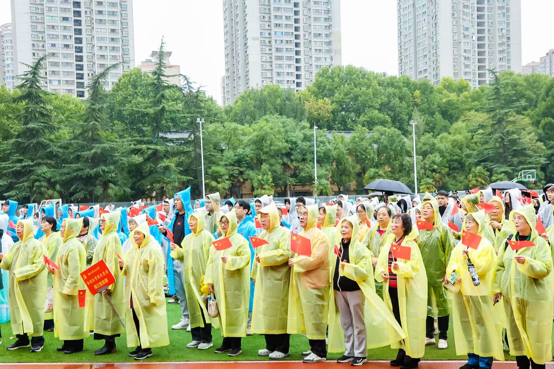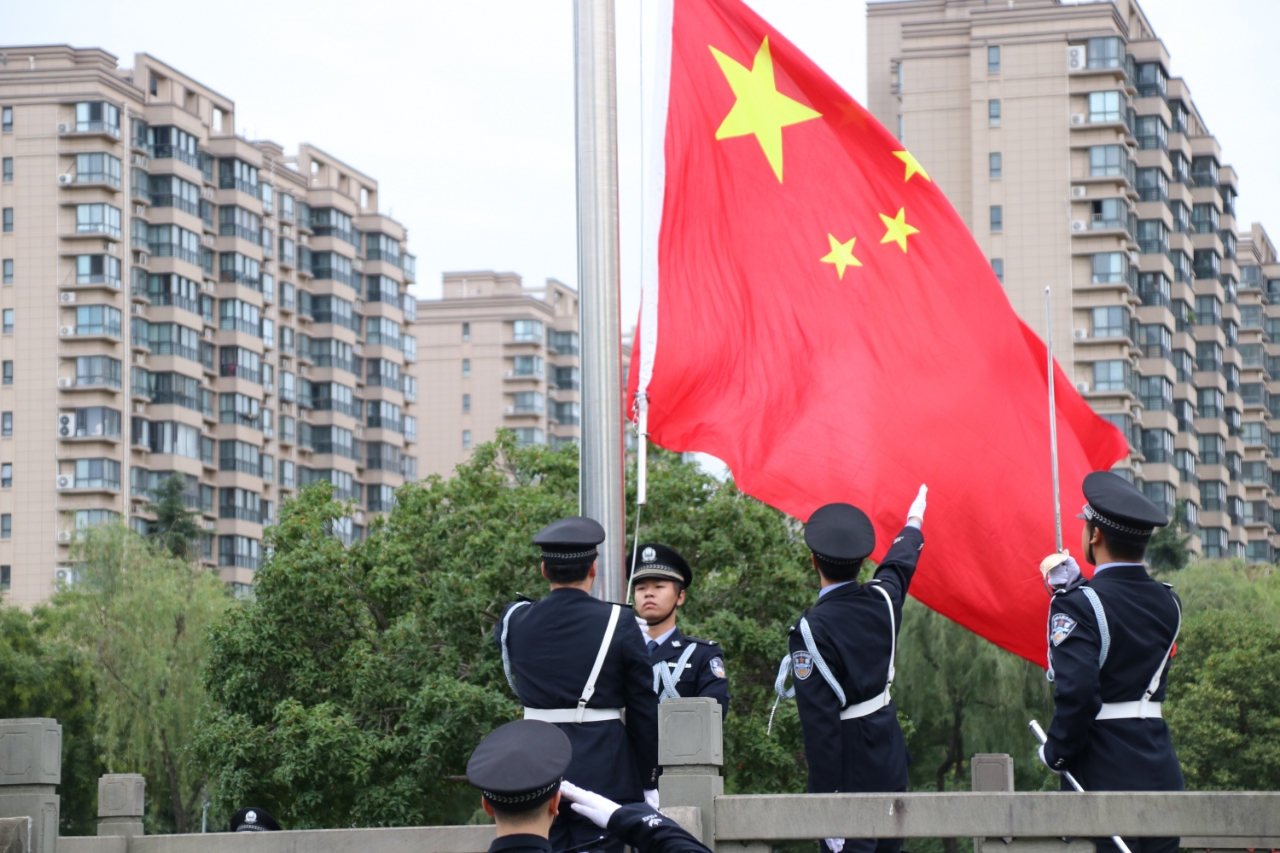 浸润着金色的秋雨,国旗护卫队成员迈着铿锵有力的步伐,护送国旗庄严入场。伴随着雄壮激昂的《义勇军进行曲》,在全体人员的注目下,鲜艳的五星红旗冉冉升起,迎着晨风猎猎招展。