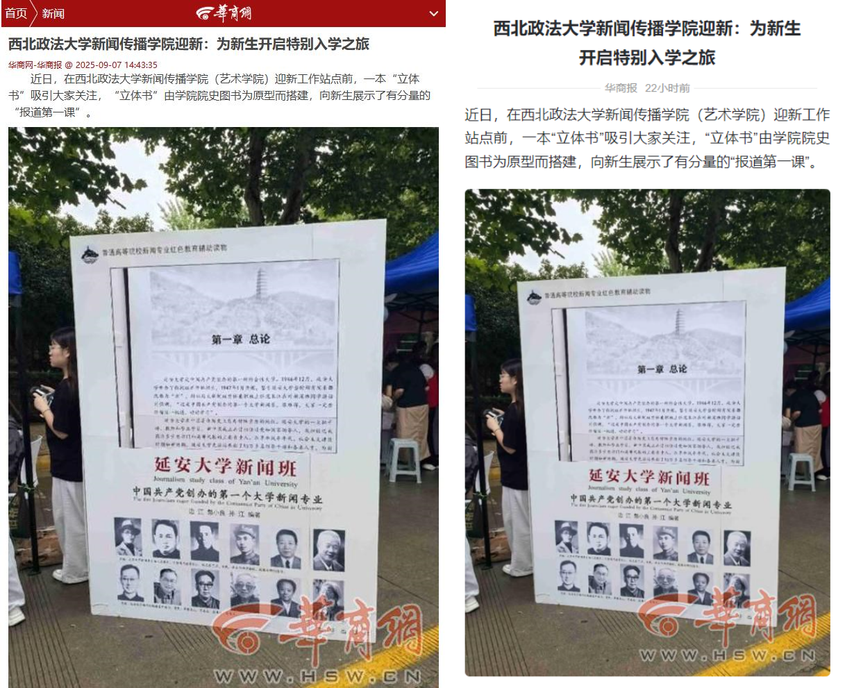 近日,在366net必赢官网新闻传播学院(艺术学院)迎新工作站点前,一本“立体书”吸引大家关注,“立体书”由学院院史图书为原型而搭建,向新生展示了有分量的“报道第一课”。