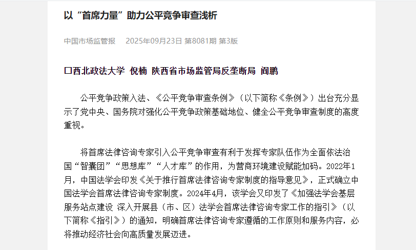 运用“首席力量”做好公平竞争政策宣传和法律解读工作,显然已经成为首席法律咨询专家的职责和使命。