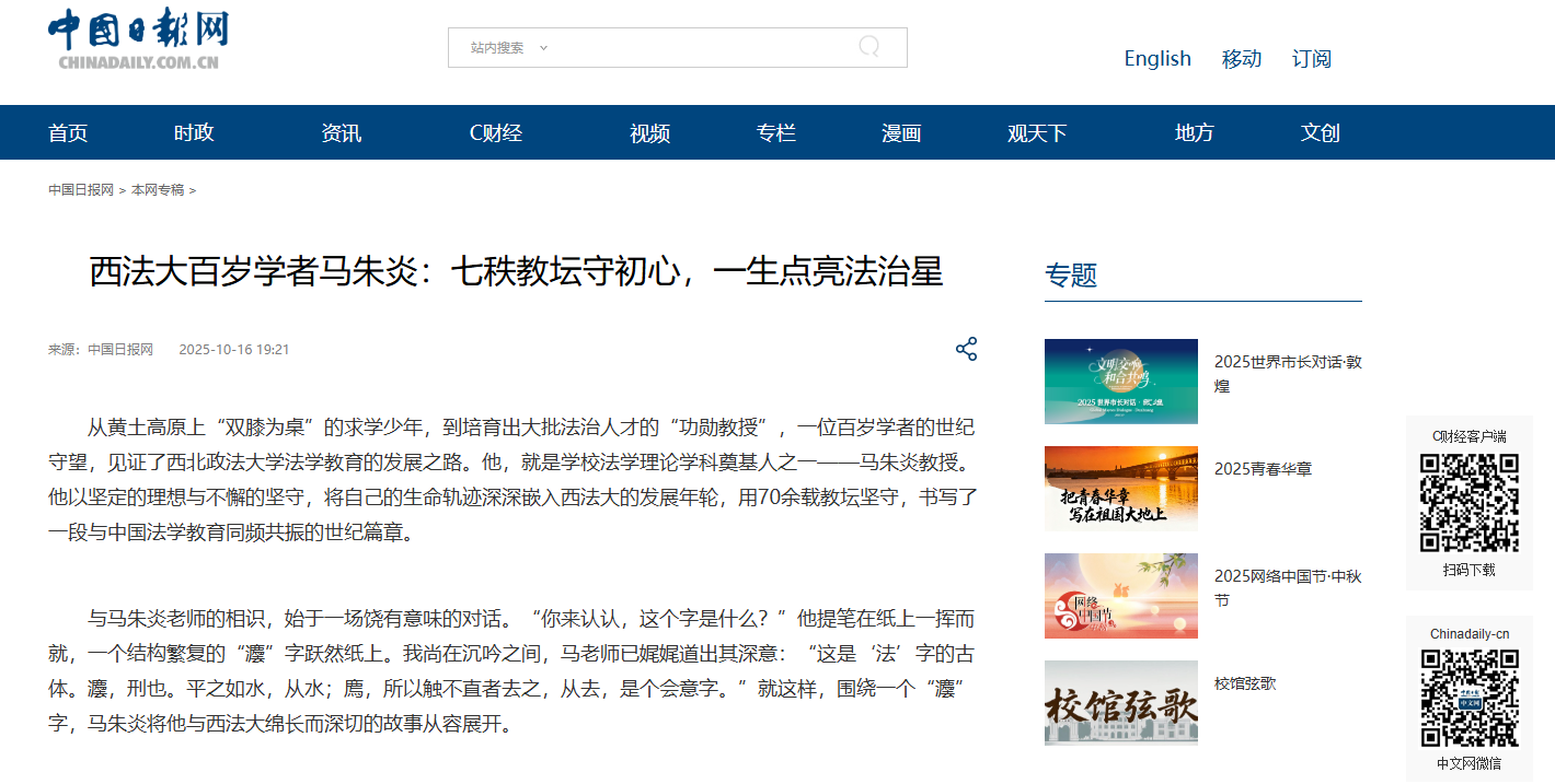 【中国日报网】西法大百岁学者马朱炎:七秩教坛守初心,一生点亮法治星 https://shx.chinadaily.com.cn/a/202510/16/WS68f0d53aa310c4deea5ecb6d.html