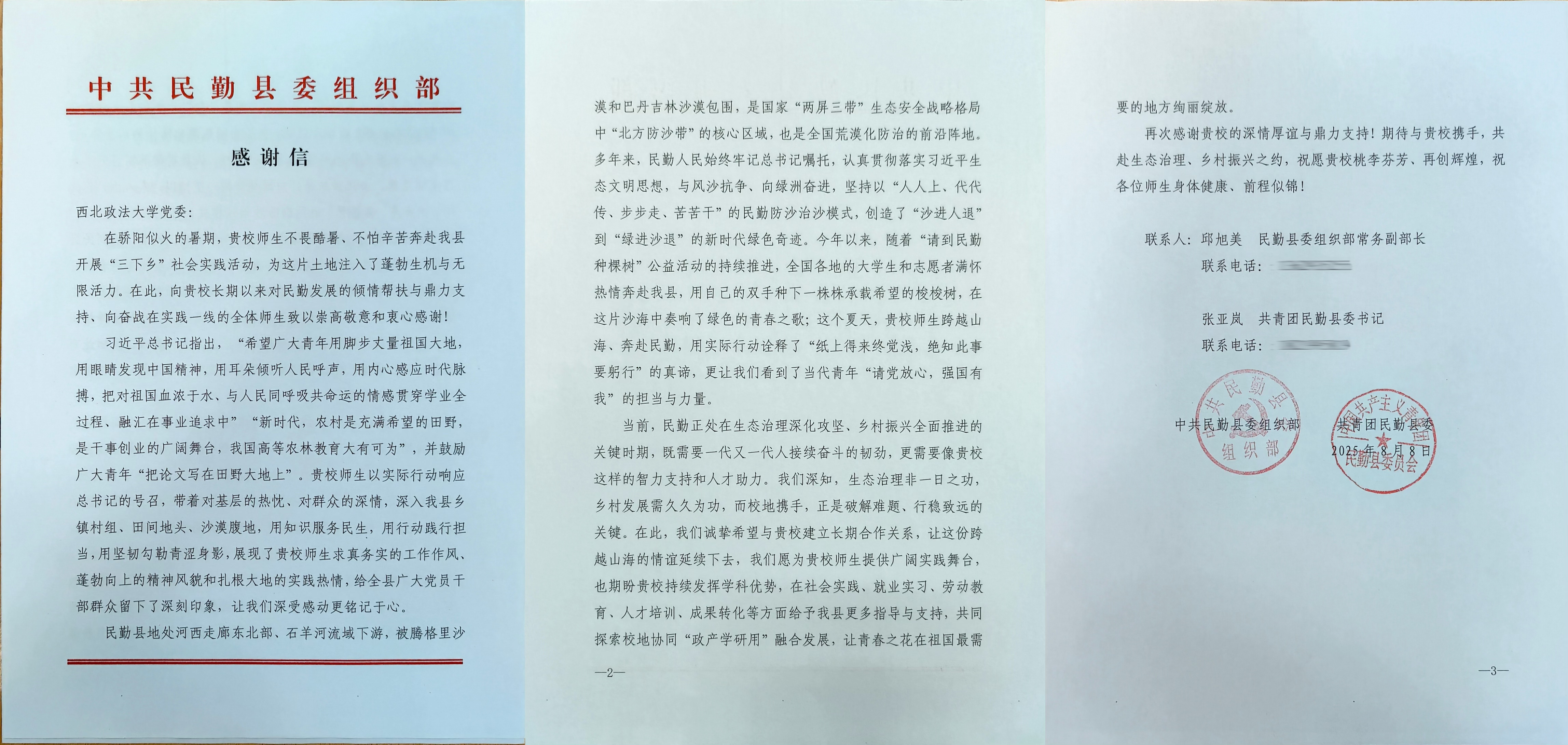 中共民勤县委在感谢信中特别提到,团队在生态建设与乡村振兴工作中展现出的“用知识服务民生,用行动践行担当”的责任意识,为当地工作提供了有力支持,也让基层群众看到了新时代青年的风貌与担当。这份认可,不仅是对团队此次“三下乡”实践成果的肯定,更是对广大青年扎根基层、服务社会的莫大激励。