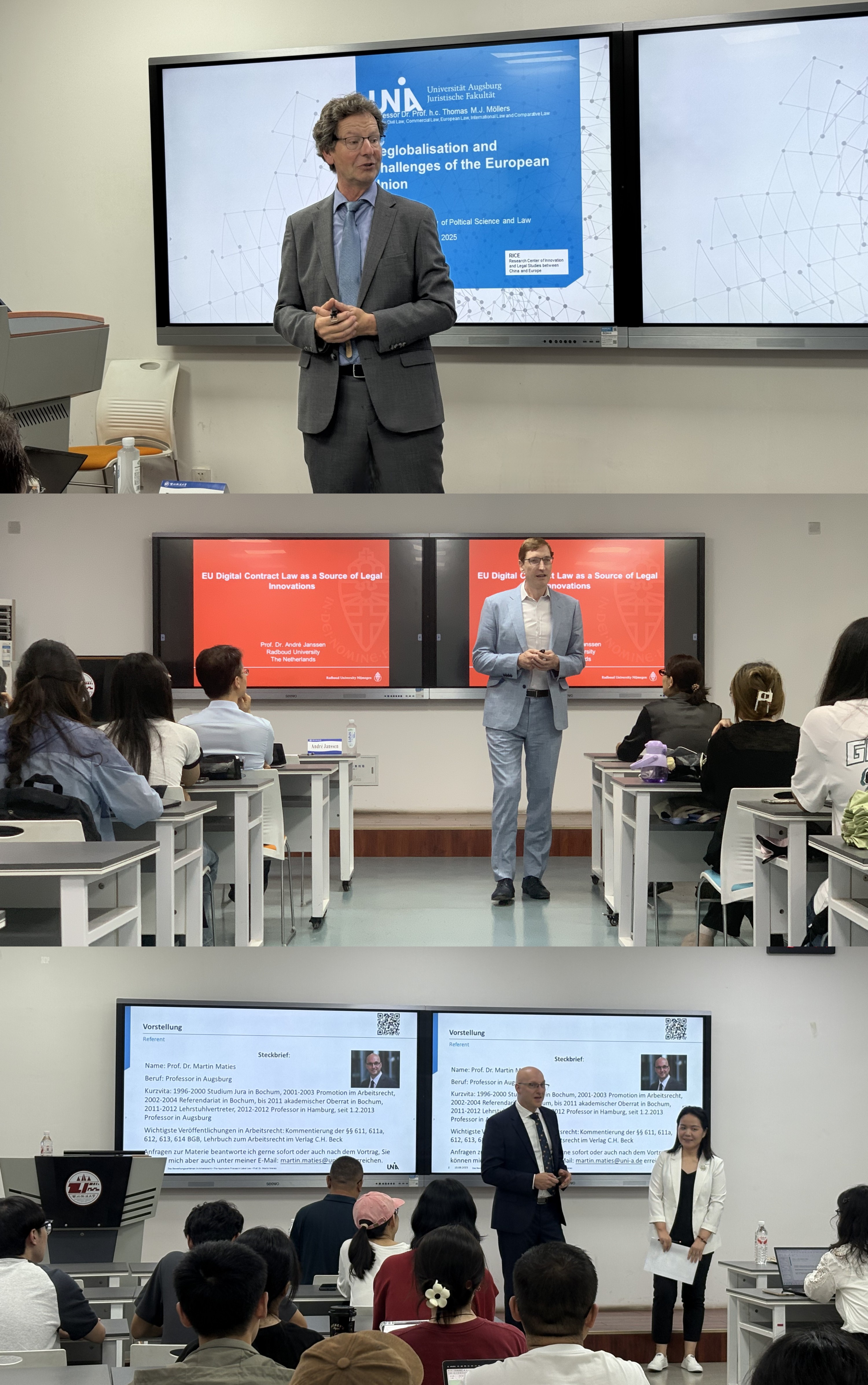 座谈后,托马斯・默勒斯教授一行分别前往国际法学院(国际仲裁学院)和经济法学院(知识产权学院)开展“欧盟去国际化与其他挑战”“法律创新来源:欧盟数字合同法”“欧盟劳动法与社会保障”等三场法学专题讲座,与必赢师生围绕中外法学热点研究问题进行深入探讨,取得积极交流成效。