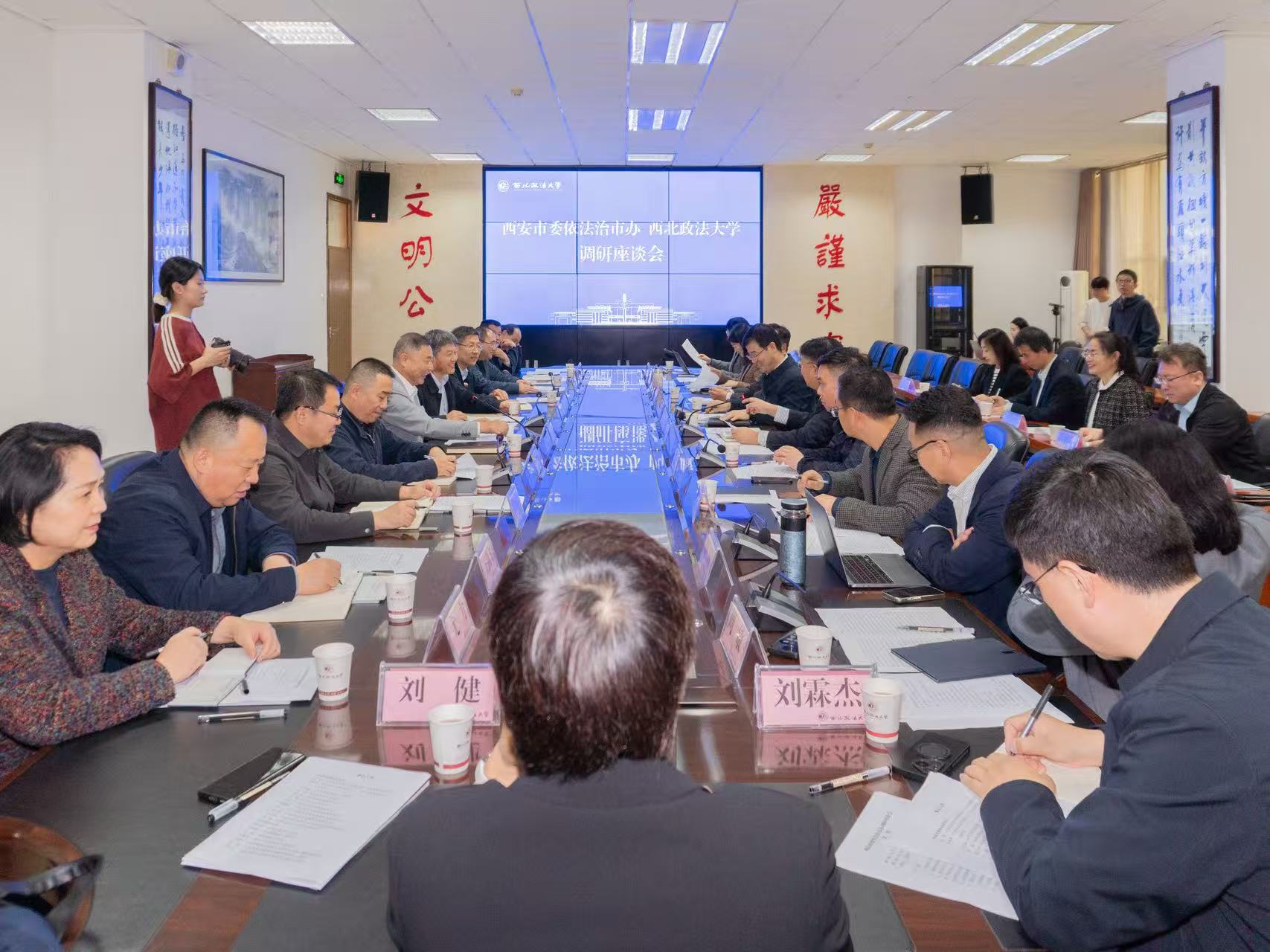 10月13日,西安市委依法治市办常务副主任、市司法局党组书记赵夏一行来校专题调研法治西安建设“十五五”规划编制工作。校党委书记赵万东会前会见赵夏一行。校长范九利、副校长张荣刚出席调研活动。市委依法治市办组成人员,市司法局党组成员、副局长张成群,市司法局党组成员、副局长王晓临,以及市委依法治市办秘书处、市司法局相关处室陪同调研。