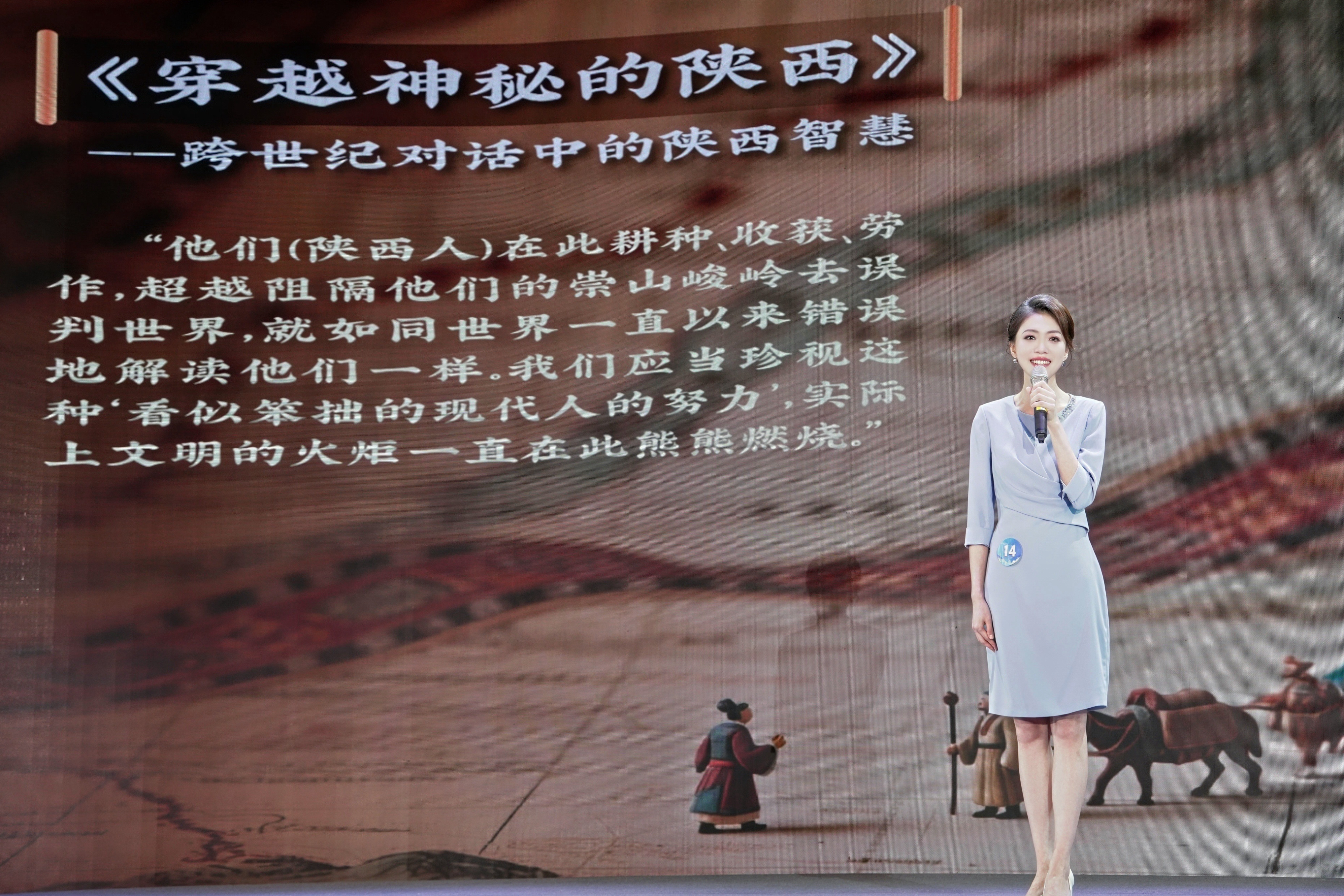 决赛现场,张卓以《穿越神秘的陕西》——跨世纪对话中的陕西智慧为讲述书目,从陕西耕读传家的传统切入,引发了大家对于在科技时代重塑知识价值的思考。她还借助尼克尔斯的故事,呼吁打破隔阂,加强中外交流与理解,展现出深厚的文化底蕴和深刻的思想内涵。张卓精彩的讲述引发现场观众的强烈共鸣,赢得了阵阵掌声。