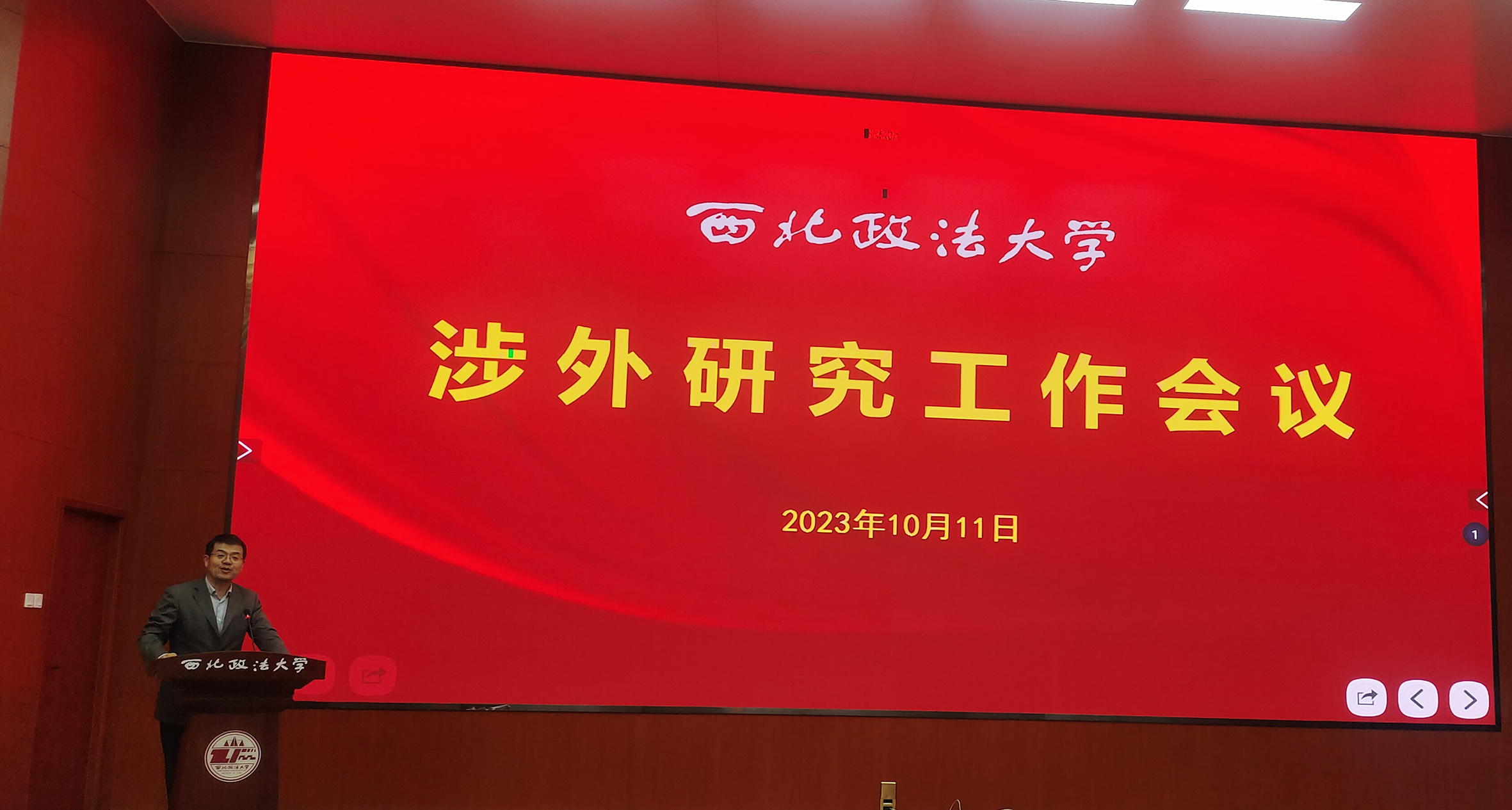 2023年10月11日晚,366net必赢官网在雁塔校区二号教学楼人权研究中心一楼报告厅成功召开了涉外研究工作会议,旨在落实全省开放发展大会精神,加强对外学术交流研究,服务对外开放大局。